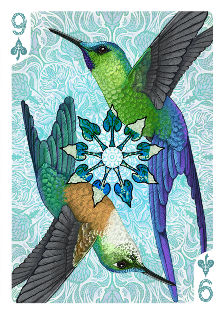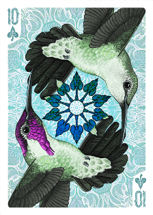 My current project that I just started is a deck of hummingbird-themed playing cards. In the past few years, I’ve become really interested in the style and design of playing cards in general, and this deck would be my third major playing card project, with the other two being owl and parrot themed. Speaking of which, I also currently have the parrot deck in production right now, as the project funded on Kickstarter a few months ago. As for my creative style, I would describe it as illustrative realism — I try to keep any species I draw recognizable, but I don’t aim for hyper-realism. I love color, and I tend to bump any color naturally occurring in an animal up a notch.