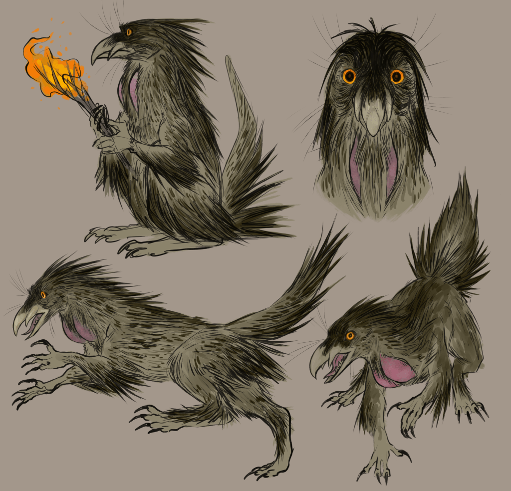 For the eagles, I had in mind that they are intelligent predators. Therefore, I gave them big eyes facing forward and hand-like claws for easily manipulating objects. I made the terrible beak shaped like 3 hooks and with backward-pointing teeth in the underjaw — designed for tearing and for the eagle to latch on to prey, being hard to shake off once it gets a good bite.