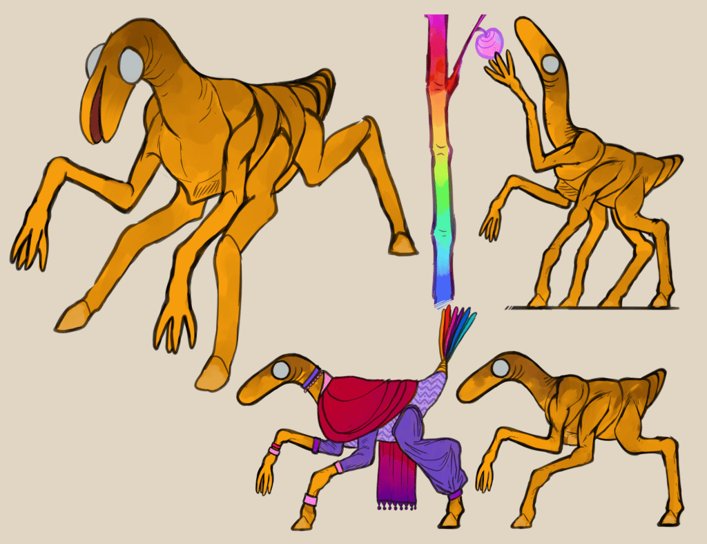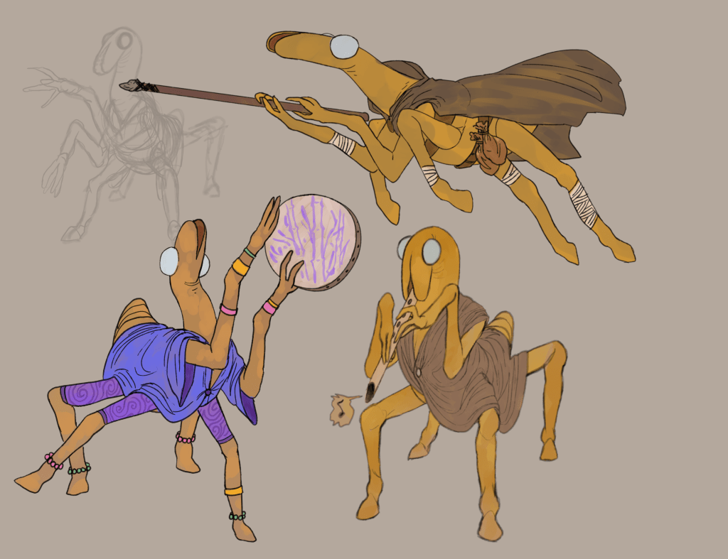 Once I had designed the basic body-plan, I was asking myself: how do you play a flute when you have 2 elbows? How do you dance and drum? What kind of clothes does it make sense to wear if your body is Glassmaker-shaped? Asking these questions and at the same time using the book as a guideline, I made these drawings. It was so much fun!