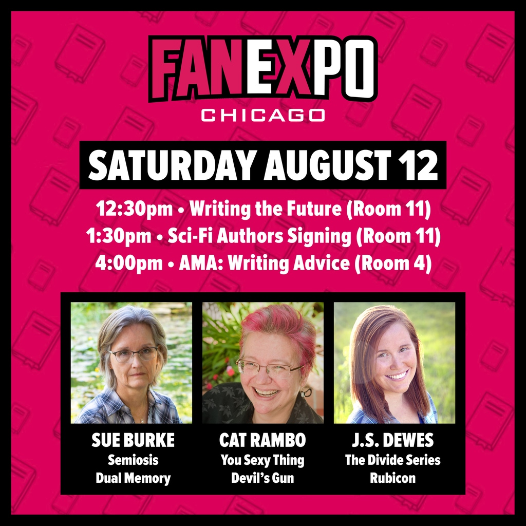 How do science fiction authors predict the future? Do you want to write a book but don’t know where to start? Cat Rambo, J.S. Dewes, and I will try to answer these and other questions for you at two panels at FanExpo Chicago on Saturday, August 12, at the Douglas E. Stephens Convention Center in Rosemont. You can also enjoy cosplay, celebrities, comics, anime, shopping, fan meet-ups, workshops, artists, tattoo alley, family-centered events, and gaming..